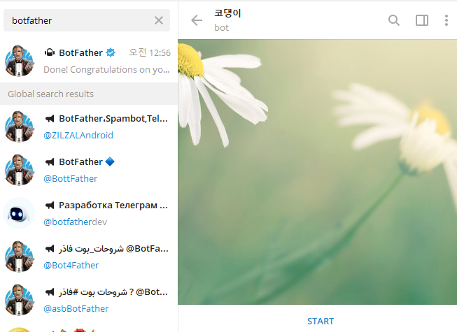 아래와 같이 검색되면.. 채팅창에 /newbot이라고 친다.