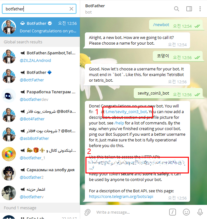 프로그램에서 봇으로 챗을 보낼 수 있는 토큰이 만들어진다. (여기서 토큰은 공개하면 좋지않다. 자세한건 여기 참조)
