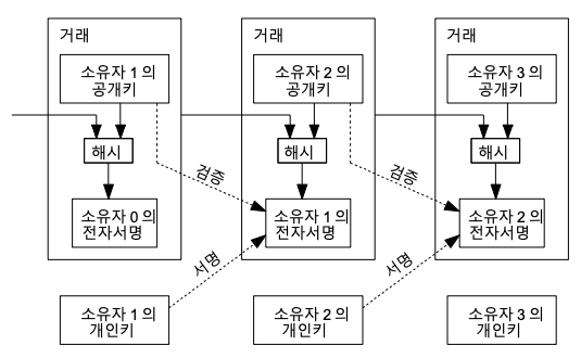 각 소유자는 전 거래의 hash 및 다음 소유자의 공개키에 전자서명함으로서 코인을 송금한다. 그리고 이걸 코인의 끝에 추가한다.