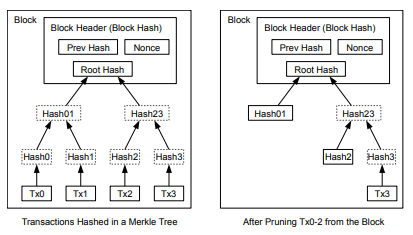 코인의 최신 트랜잭션이 충분한 블록 아래에 묻히면 디스크 공간을 절약하기 위해 이전에 사용한 트랜잭션을 폐기할 수 있습니다. 블록의 해시를 손상시키지 않고 이를 용이하게 하기 위해 트랜잭션은 블록의 해시에 포함된 루트만 포함하여 Merkle Tree[7][2][5]에서 해시됩니다. 그런 다음 오래된 블록은 가지치기를 통해 압축할 수 있습니다. 내부 해시는 저장할 필요가 없습니다.