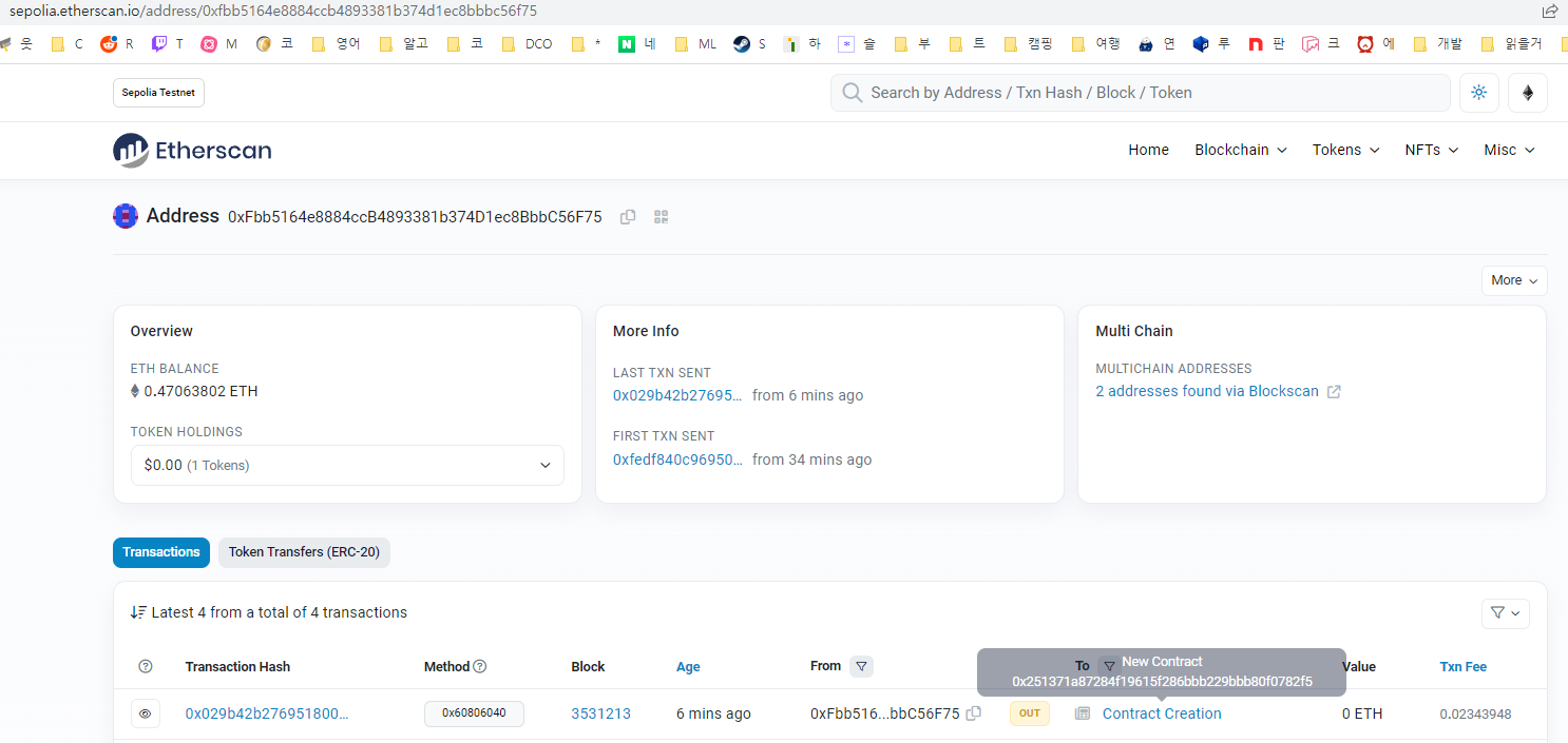 9. 배포성공후 이더스캔에 가보면 다음처럼 Contract Creation 트랜잭션을 볼 수 있다.