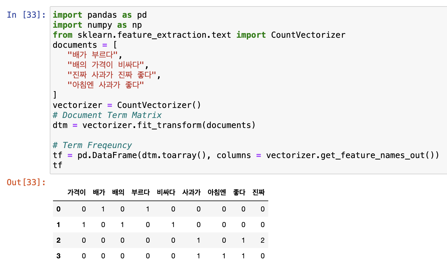 벡터화 방법은 인덱스 위치별 등장횟수를 카운팅하는 단순한 방법이다.