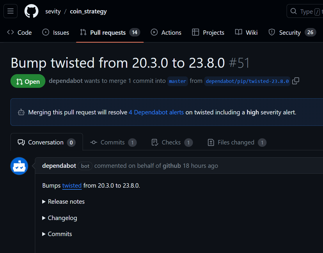 여기서 해당 PR을 확인하고 git pull origin dependabot/pip/twisted-23.8.0:bump-twisted 이렇게 하는 방법도 있다.