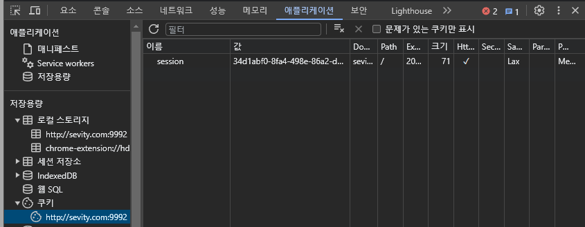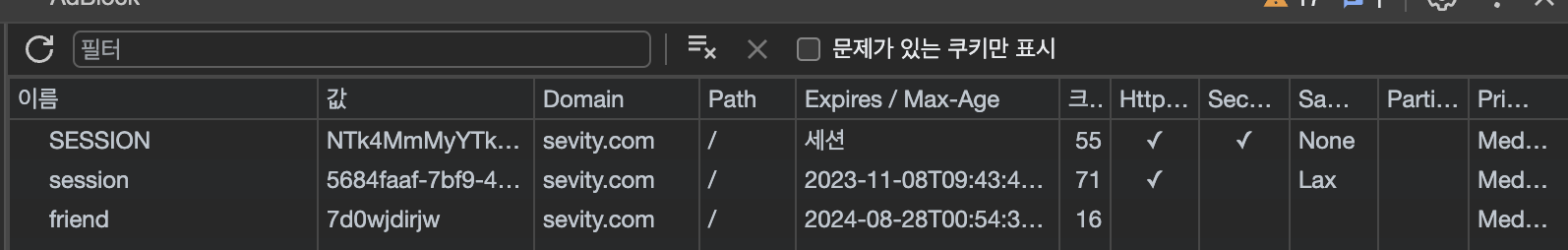 아래처럼 브라우저 개발자 도구에서 확인가능하다(애플리케이션탭 > 쿠키섹션)